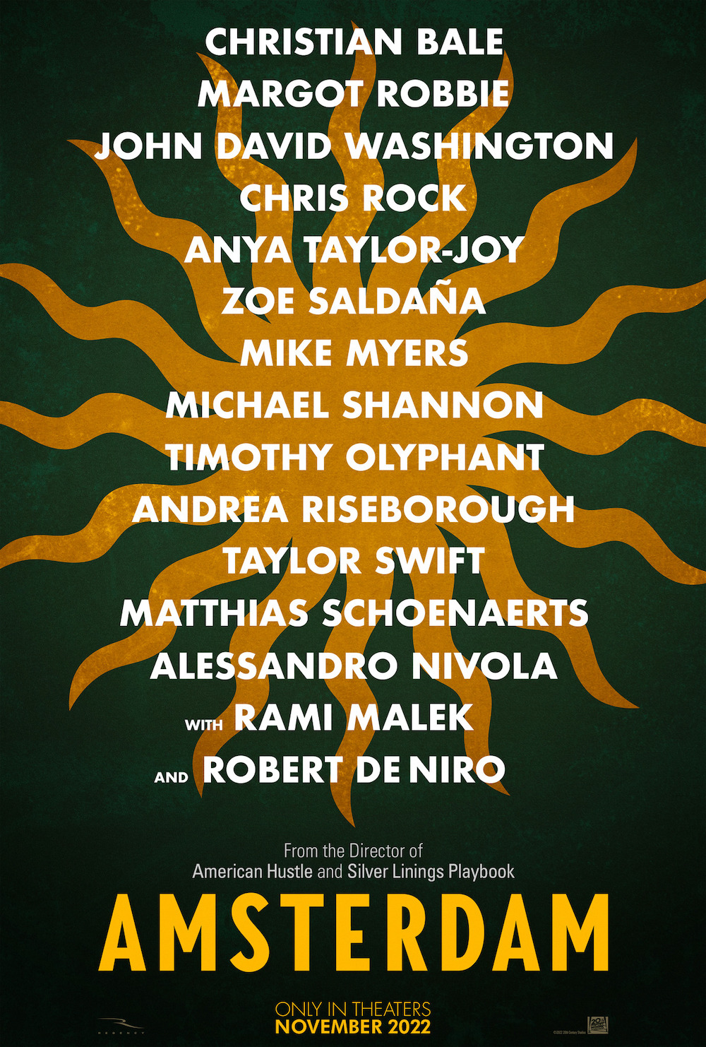 Personnage tyrannique sur les plateaux et capable de comportements problématiques en dehors, David O. Russell n’est pas de la famille des réalisateurs les plus recommandables même s’il est clairement surdoué pour raconter des histoires avec des images. Après 7 ans d’absence, on le retrouve donc cette année avec Amsterdam, un nouveau drame/polar en plein contexte historique. Il est évidemment l’auteur du scénario et a fait appel au génie Emmanuel Lubezki pour éclairer son film. Et devant sa caméra, c’est tout simplement un festival avec Christian Bale, Margot Robbie, John David Washington, Chris Rock, Anya Taylor-Joy, Zoe Saldana, Michael ShannonMike Myers, Timothy Olyphant, Andrea Riseborough, Taylor Swift, Matthias Schoenaerts, Alessandro Nivola, Rami Malek et Robert De Niro. Faut bien avouer que ça a quand même de la gueule étalé comme ça.
