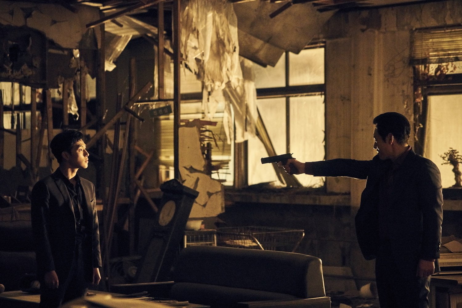Dans les deux cas ces protagonistes sont le reflet d’un individu manipulé par un système qui le dépasse. Le point névralgique étant la relation privilégiée, pour ne pas dire paternaliste, qu’il entretient avec Jae-Ho. Au départ simple faire valoir du caïd, Hyun-Soo va très vite voir en ce dernier un mentor dans l’univers de la pègre qui le fascine de plus en plus. Pour traduire ce changement de psyché, la mise en scène, comme le montage, délaisse l’ostentatoire pour une approche de plus en plus élégante. La superbe arrivée de Hyun-Soo dans une boite de nuit russe filmée en steadycam en est un bon exemple. Le film révèle ainsi un traitement anachronique de la figure du gangster sur grand écran, qui redevient cette figure tragique où la question de l’honneur est primordiale. Jae-Ho devient un personnage introspectif contemplant le poids du passé et de ses erreurs. La manipulation narrative de Sans pitié n’est ainsi jamais gratuite dans la mesure où elle se base avant tout sur la perception faussée que ce fait Hyun-Soo des différentes personnes gravitant autour de lui. C’est justement ce traitement astucieux du jeu de miroir qui permet au film de dépasser le stade du cool pour toucher à une émotion sincère et tragique. De tragique il en est question dans le dernier acte, où la réalisation délaisse totalement tout artifice, opte pour un rythme beaucoup plus lent, se recentre sur l’intimité des personnages. Un souci d’épure qui prend tout son sens avec la terrible conclusion du long métrage qui fait de Sans pitié une véritable tragédie au sens antique du terme, soulignée par la musique qui confère aux dernières images une ambiance mélancolique qui reste gravée en mémoire.